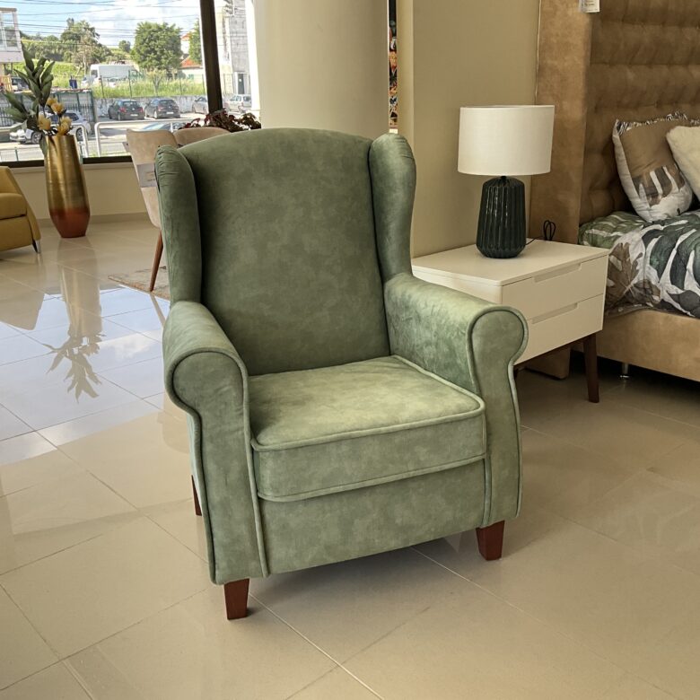 Cadeirão com pés cor cerejeira. Em Microfibra cor verde
